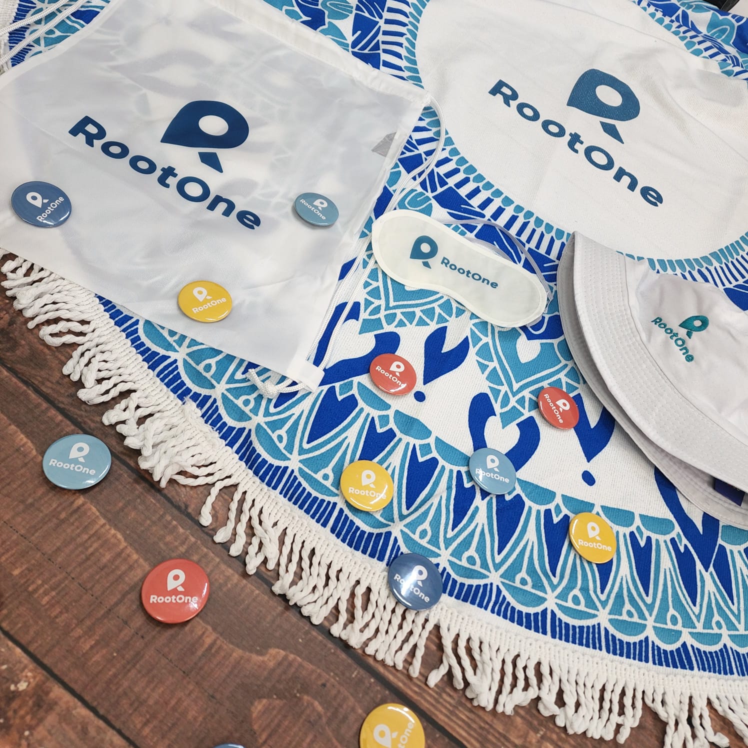 כל מה שצריך לחופשה! מארז של מגבת חוף, תיק שרוך, כובע, כיסוי עיניים וסיכת דש במיתוג אישי.